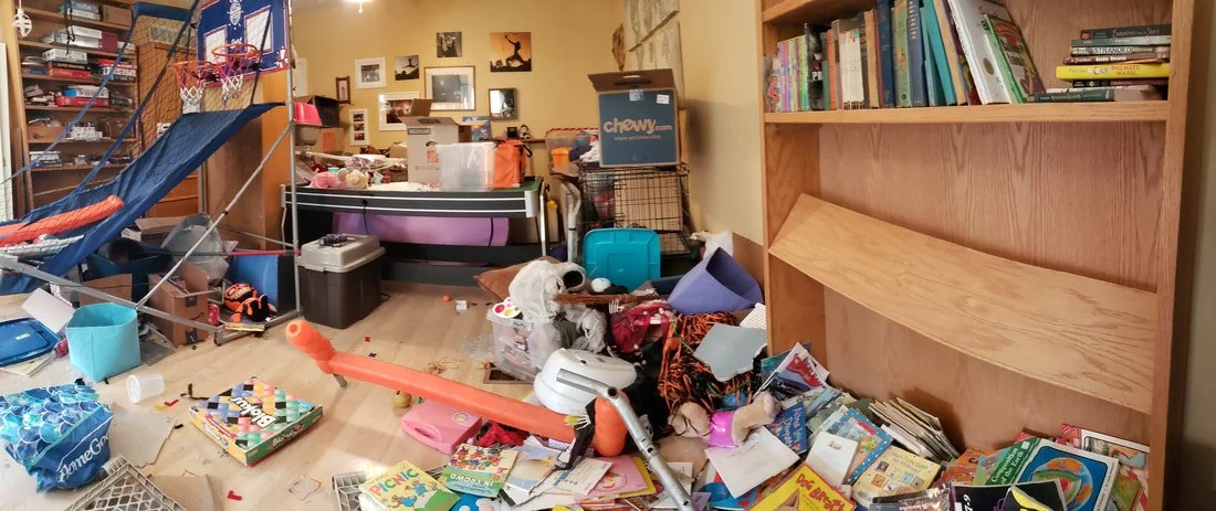 When spaces like this get overwhelming, it’s not because anyone did something wrong—it’s because real life happened. Playdates, projects, moving boxes, and ambitious shelving (RIP to the bookshelf panel on the right) all converged into one very busy room. But that’s exactly what organizing and decluttering services are for. Whether it’s a home organizer, a garage organizing company helping with overflow, or a closet organizer service setting up storage zones, we come in ready to turn chaos into calm—with compassion and a label maker.